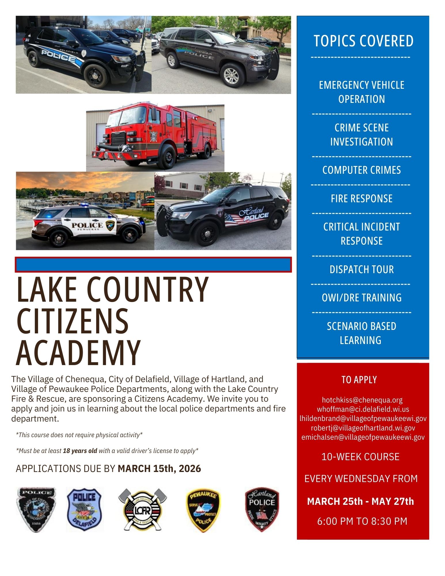 The Village of Chenequa, City of Delafield, Village of Hartland, and Village of Pewaukee Police Departments, along with the Lake Country Fire & Rescue, are sponsoring a Citizens Academy. We invite you to apply and join us in learning about the local police departments and fire department.